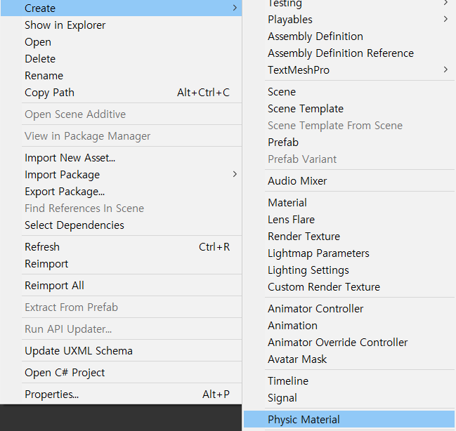 Assets에서 마우스 오른쪽을 눌러서 Physic Material을 생성 해 준다.