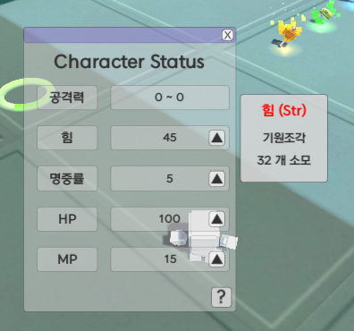 스탯은 스탯 창에서 강화할 수 있으며, 레벨이 없기 때문에 여러모로 만능(?)인 기원 조각을 이용하여 강화하게끔 하였다.